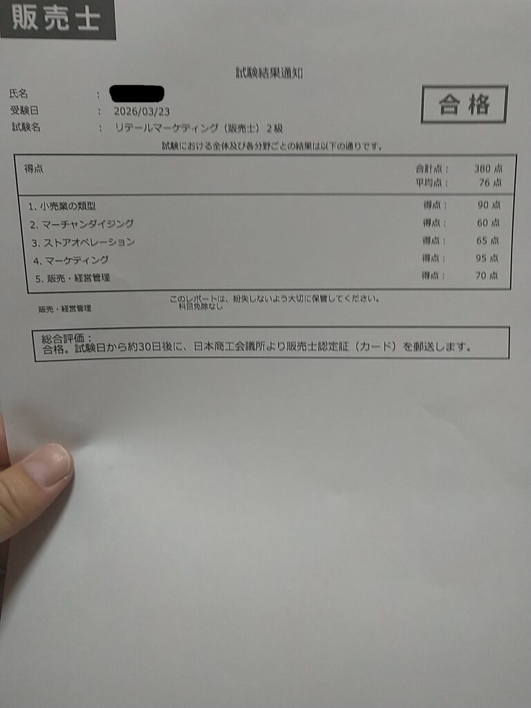結構ギリギリでしたが、76点で一発合格できました。マーチャンダイジングやストアオペレーションは初めて学んだこともあり、得点は低め。「〇×」と「四択問題」で構成されていたので、救われたという感じです。結構所見の用語とかもあり、試験中は焦りました。合格できればよい方は上述したテキスト&問題集で支障はありませんが、高得点を狙うのであれば公式テキストのほうがよいのかもしれません。公式テキストを読んだことがないので、あてにはなりませんが。。。(2026/3/29)